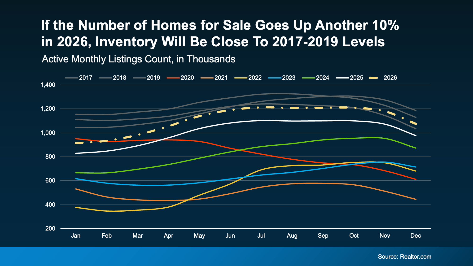 Here’s a graph that shows what an extra 10% would do for the market this year. You can see that projected growth (shown in the dotted line) hits inventory levels seen in 2017-2019 by roughly this fall (the gray lines). That means we may reach normal by end of year, nationally: